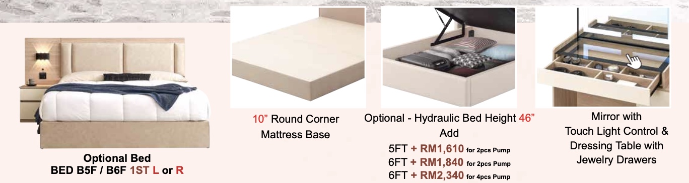 Select Queen or King size with standard headboard or hydraulic storage bed. Available in multiple color tones to match your KL condo interior.